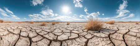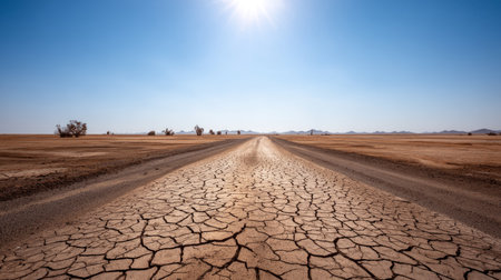 A vast, cracked desert under the scorching sun with a clear blue sky above, symbolizing environmental disaster and climate change. the dry land contrasts against the vibrant sky, emphasizing its impact on nature's environment. this visual representation is designed to convey that climate research em