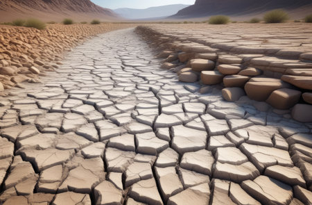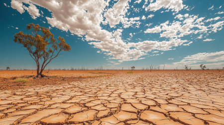 A barren landscape with cracked ground, the deep fissures in the soil highlighting the devastating impact of drought on the environment.