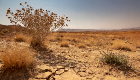 a dry and brown landscape in the desert during a summer drought with wilted plants struggling to survive on the parched ground