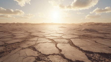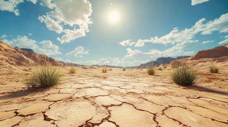 Desert land sprawls under a bright sun, showing casing cracks in the ground as climate change impacts the environment profoundly.