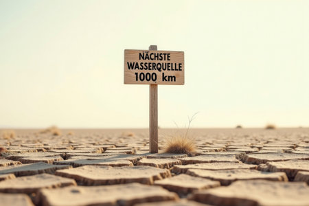 A wooden sign stands on cracked, parched ground. With the inscription Next water source 1000 km, it symbolizes despair and hopelessness caused by extreme drought and water scarcity. Nearest water source 1000 km