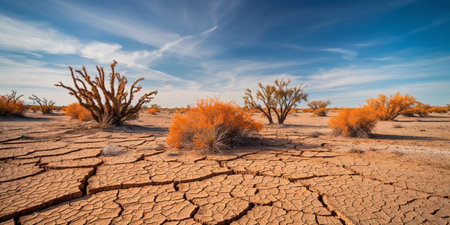 AI Generated. an image of a desert with cracked earth and sparse vegetation