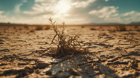A solitary plant thrives in a dry desert landscape under a dramatic sunset, symbolizing resilience and survival in harsh environments. Perfect for nature themes.