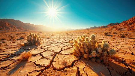Witness the stark beauty of a desert landscape under a brilliant sun in this captivating image. The scene features dry, cracked earth and resilient cacti vegetation against a bright, clear sky, with majestic desert mountains on the horizon. This scenic view evokes feelings of heat, drought, and the raw power of nature. Perfect for projects related to climate change, travel, adventure, and the challenges of an arid environment, this panoramic shot captures the essence of a barren wilderness.