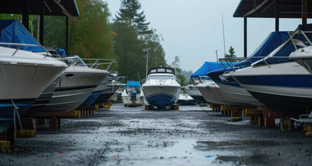 Front View of Speedboat and Motorboats in Yacht Garage, Cloudy Summer Day