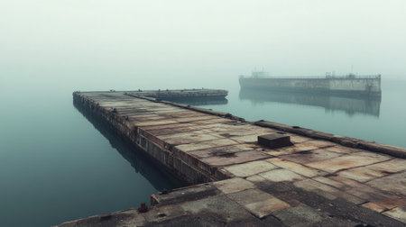 An old, weathered pier extends into the misty waters, surrounded by a peaceful atmosphere. Calm waves lap against the rusted supports, creating a tranquil yet eerie setting.