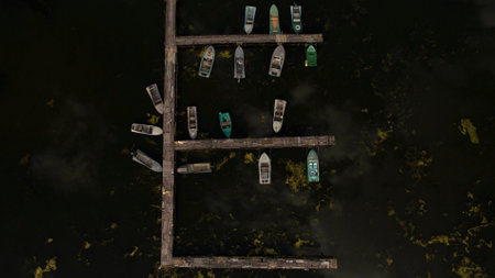 Top view from sky of group of wooden fishery boat at the sea marina with day lighting.