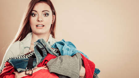 Daily routine in household laundry wash and ironing. Young girl hold pile of colorful clothes.
