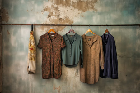 clothes on hangers against a textured wall backdrop, created with generative ai