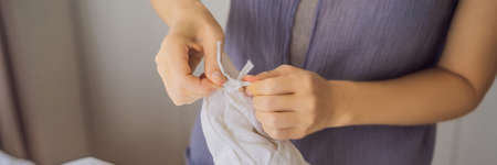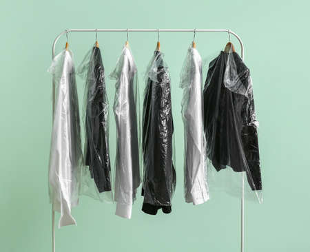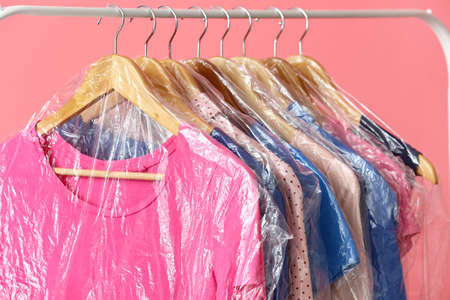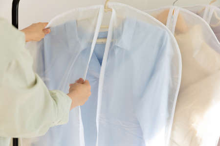 aesthetic laundry concept_covering clean clothes in plastic bags after dry cleaning
