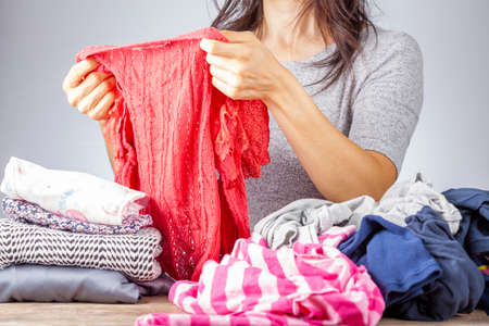 A caucasian woman is folding clean dresses on a wooden desk. There is a pile of unfolded dresses and some folded and tidied ones next to it. Concept for house wife, chores and housework.
