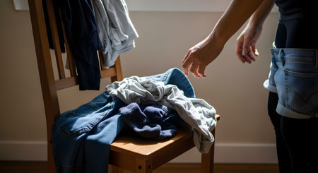 A messy pile of clothes, including blue jeans and socks, is draped over a wooden chair in a sunlit room. A hand reaches towards the pile, suggesting the act of getting dressed or tidying up a cluttered bedroom.