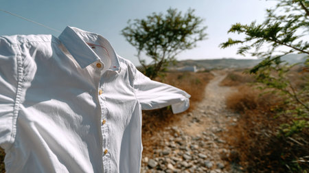 A white shirt hangs on a clothesline against a scenic outdoor backdrop. The image captures sunlight filtering through foliage, evoking a sense of tranquility and freedom in nature.