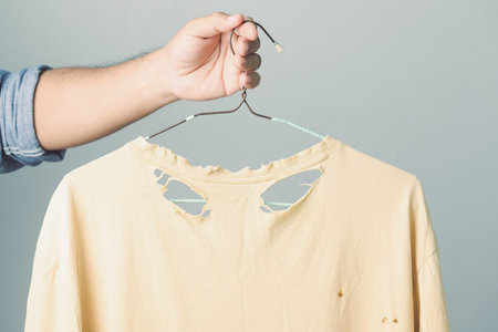 Used wrong type of washing powder concept. Man holding yellow torn and old T-Shirt. Studio shot on grey wall background.