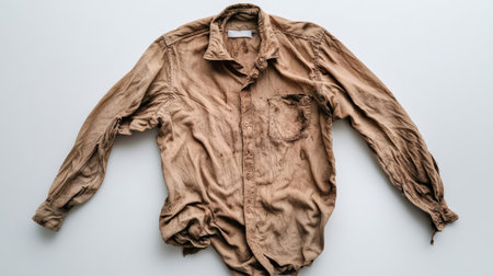 A worn brown cotton shirt displayed flat on a white background, ideal for showcasing textiles, fashion styles, and vintage clothing themes in diverse stock photography projects.