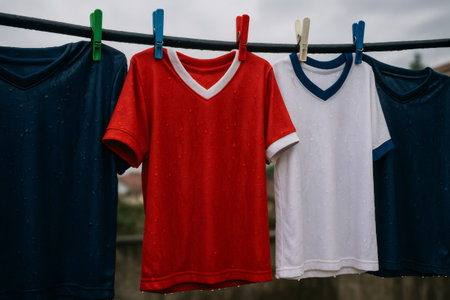 Washed sport uniforms hanging on a clothesline with clothespins. Raindrops covering the wet fabric, symbolizing laundry and active lifestyle