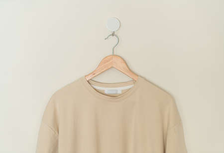 Woman choosing what T-shirt she should wear today mockup copy space minimalism clutter