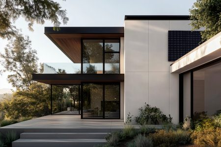 This captivating image features a modern home with stunning architecture bathed in warm evening light. Its sleek lines and elegant design invite comfort and relaxation.