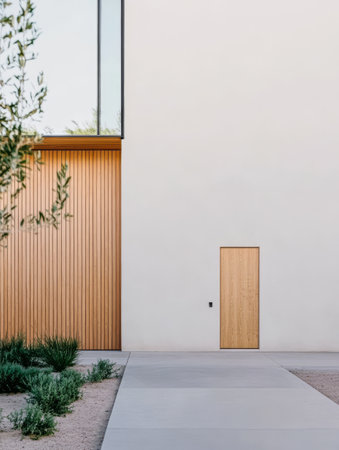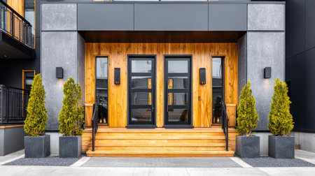 The image showcases the entrance of a contemporary building, highlighting a wooden door flanked by decorative potted trees. The composition features clean lines and symmetrical elements. The exterior includes a blend of textures, such as wood and stone. Suitable for commercial projects or editorial content related to architecture or design.