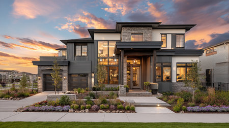 Modern home exterior showcases elegant architecture with beautiful landscaping under vibrant sunset skies.