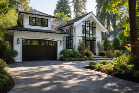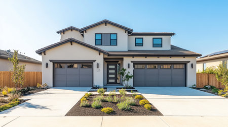 New modern home with a two-car garage and stylish architectural design, combining luxury and functionality.