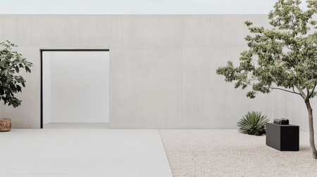 A stylish outdoor area showcases clean lines and a neutral palette. A single tree stands next to a sleek black structure creating a tranquil environment. Natural elements enhance the simplicity.