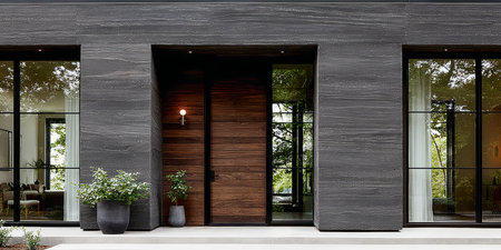 A sleek contemporary house displays a bold texture on its exterior walls. The modern wooden door and large windows create a bright entryway surrounded by greenery, enhancing the tranquil atmosphere.