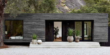 This contemporary house features a sleek wooden facade and expansive windows surrounded by greenery. Stone steps lead to a welcoming entryway.