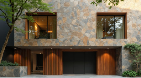 European modern house with a sleek facade, geometric patterns, and a mix of stone and glass elements, highlighting contemporary aesthetics