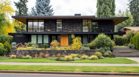 A stunning modern home showcases sleek architecture and large windows. The beautifully landscaped yard complements the serene atmosphere of this elegant residence.