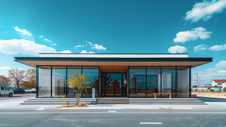 This image showcases a modern building featuring clean lines and a minimalist design. The exterior incorporates large glass windows, wooden panels, and a contrasting black facade. The composition is balanced with natural lighting, suggesting an urban setting suitable for various editorial and commercial projects.