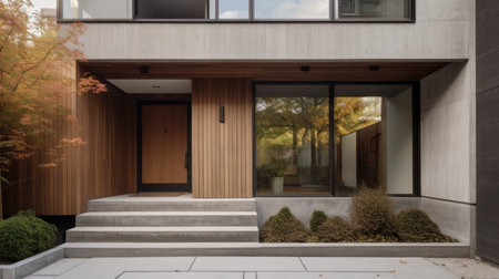 Home architecture design in Contemporary Style with Front door constructed by Wood and glass material. Transitional architecture with modern elements. Generative AI AIG25 .