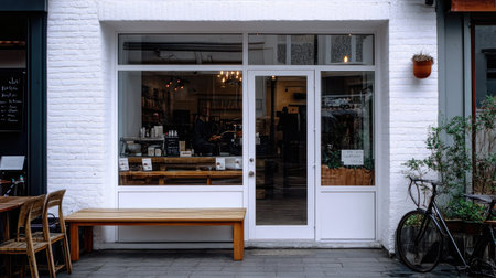 A contemporary coffee shop entrance with white walls, large glass doors, and a wooden bench, creating a stylish and inviting look.