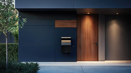 Modern mailbox in dark blue with a wood accent panel, enhancing the entryway of a contemporary home.