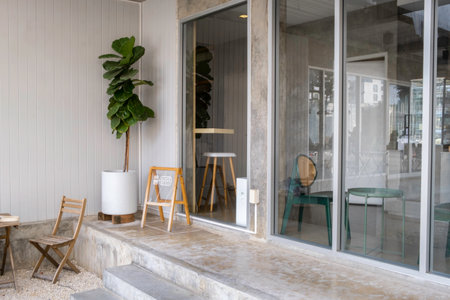 Neat coffee shop frontage, white wall, glossy glass windows reflecting the street, and one carefully positioned chair for aesthetic composition