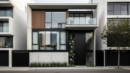 Minimalist townhouse exterior showcasing clean lines and neutral tones, modern design. generated by ai