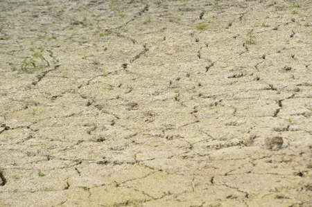Earthy soil eroded by the sun. The lack of water has created cracks in the soil. Despite the drought, some plants are present in a sparse way.