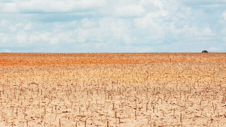 Warm dry cracked land with dead cropps, climate change concept with extreme heat