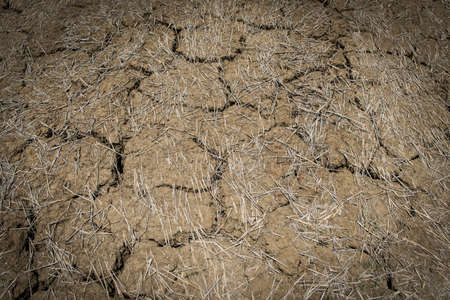 dried dead grass on dry earth and cracked ground texture, broken split soil land