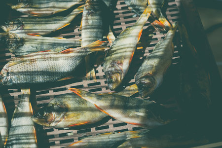 Fish background.A lot of air-dried, salty freshwater bream on a dark wooden ancient table.River fish.
