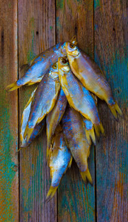 A bunch of dried salted fish hangs on a background of wooden planks. Making beer snacks at home with your own hands