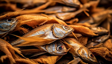 Dried, smoked, small fish used in Asian cuisine. Cooked sprat fish background or pattern. Delicatessen dried, smoked, sprat fish for beer on street food festival.