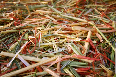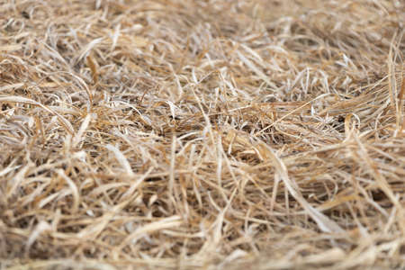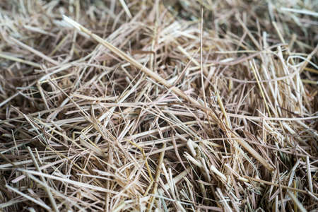 Rural agriculture objects and details concept. Detailed closeup dry of scattered hay