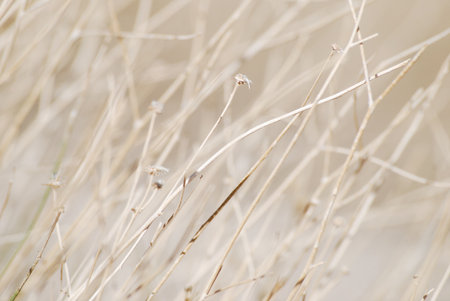 Soft focus of beach dry grass, reeds, stalks blowing in the wind at golden sunset light.
