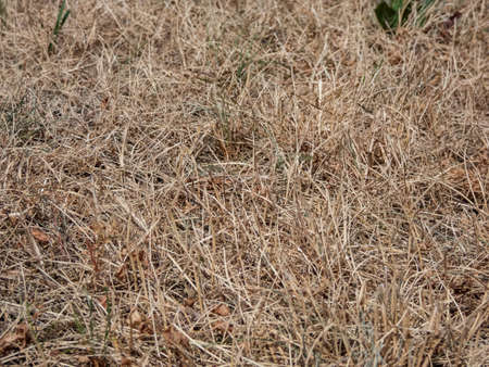 Yellow, completely dried out grass and lawn exposed to full sun, hot weather and lack of rain after prolunged heat in summer