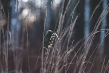 one bent of grass in front of blurred dry grass and blurry ronded bokeh of forest in sunset. winter minimalism