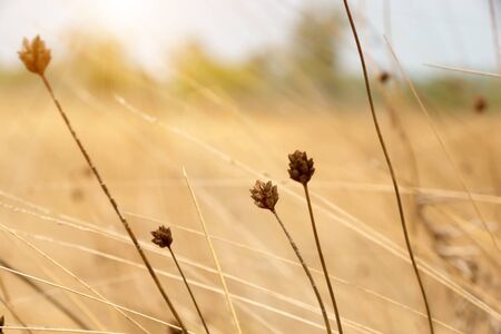 Selective soft focus of dry grass, stems blowing in the wind at golden sunset light. Nature, summer, grass concept.