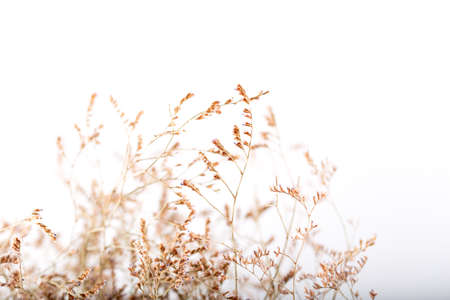 Bouquet of field dried grass on a white background. Rustic vintage hipster style. View from above