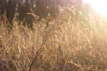 Grass in the frost. Frost on the grass in the morning sun. Winter natural plant background.