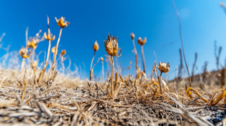 Capture of dried flowers reaching toward a clear blue sky, showcasing the beauty of nature's resilience in a sunlit, serene landscape. Perfect for illustrating themes of growth and tranquility.